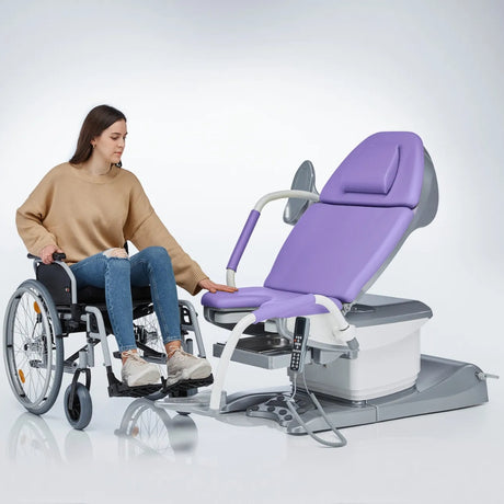 L’installation de la patiente est facilitée par une faible hauteur d’accès et par des supports de pieds escamotables, un réel atout pour les personnes à mobilité réduite. Le Medi-matic peut être utilisé en position totalement allongée, permettant la réalisation d’échographies sans obstacle, et en position déclive selon la configuration du fauteuil.