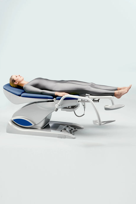 Le confort de la patiente est renforcé par une largeur de dossier pouvant atteindre 680 mm, des coussins bombés ergonomiques et une têtière aimantée. L’accès reste facile grâce à la faible hauteur d’assise, comme sur la gamme Arco. L’Arco-matic a d’ailleurs été récompensé par le Red Dot Design Award, confirmant la cohérence de son design et de sa fonctionnalité clinique.