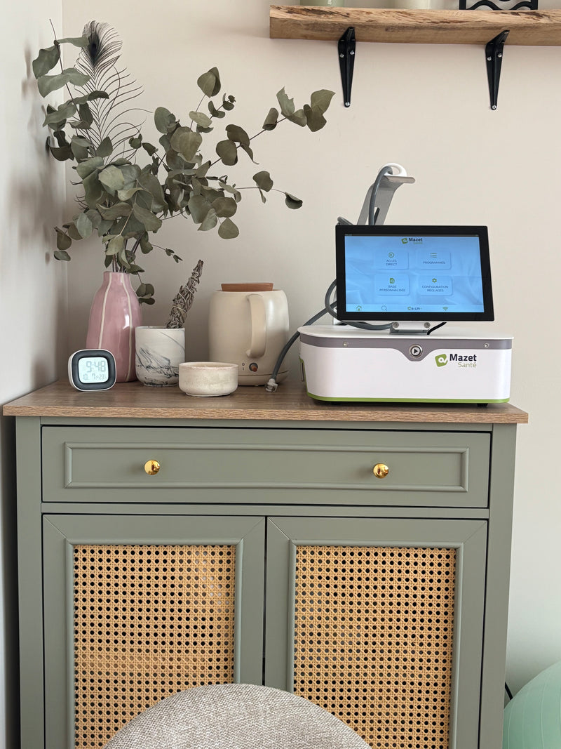 L'installation comprend également un B-Lift+, appareil de vacuothérapie signé Mazet Santé, spécialement conçu pour des soins cicatriciels ciblés et efficaces. Cet équipement médical de pointe permet de traiter les adhérences cicatricielles, fréquentes chez les patientes ayant subi des interventions chirurgicales dans le cadre de leurs traitements oncologiques.