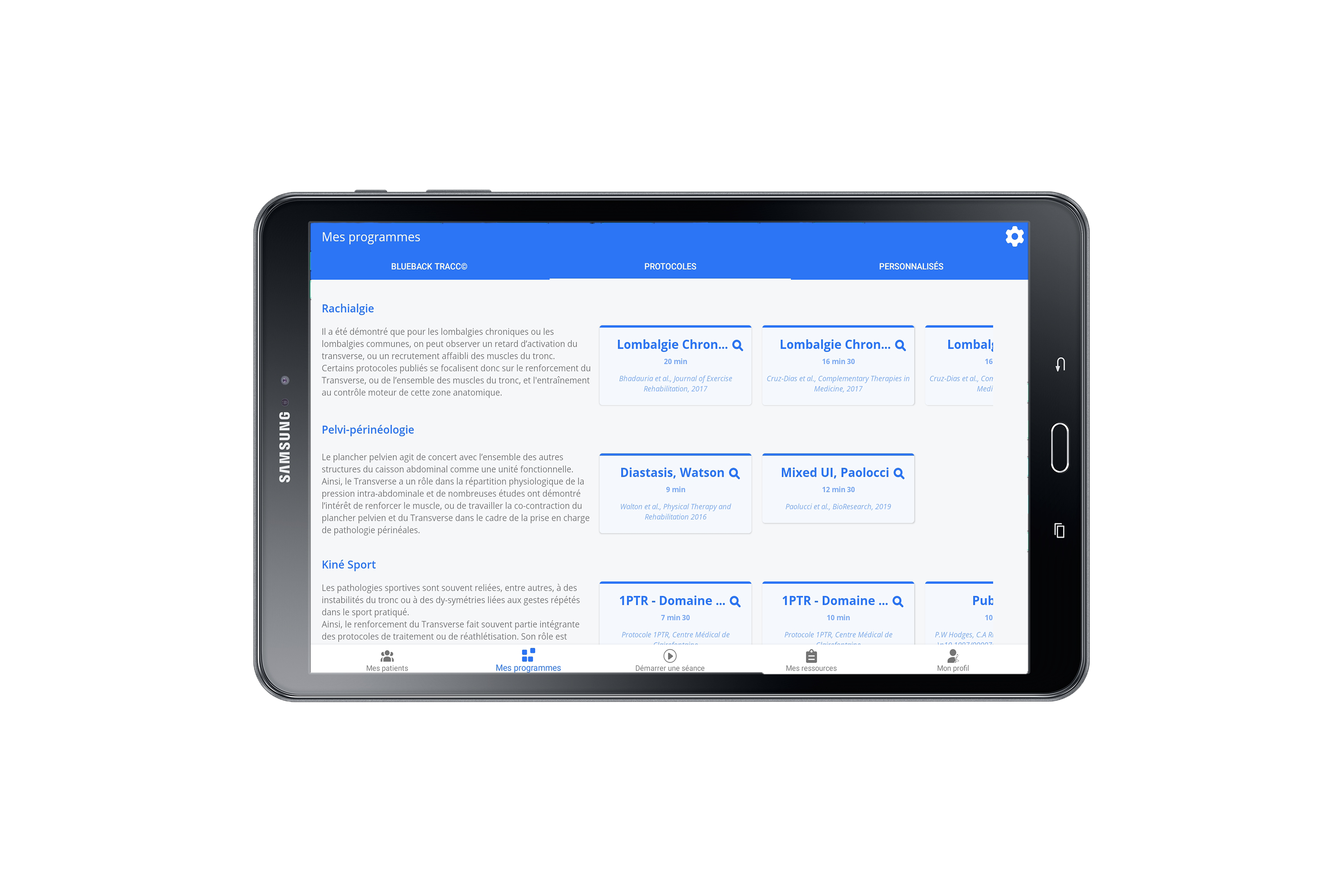 La configuration Expert est le pack le plus complet pour le Blueback Physio. Il permet de guider votre patient à travers des programmes sur mesure pour qu'il passe de la prise de conscience de ses muscles profonds à la parfaite maîtrise du gainage profond. Des objectifs et un niveau de difficulté peuvent être instaurés pour s'adapter à chaque utilisateur. Le Blueback Physio fonctionne avec une application dédiée pour accompagner votre patient de manière ludique.