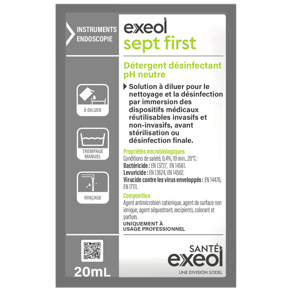 - Le détergent Exeol Sept First est conçu pour le nettoyage et la désinfection par immersion des instruments, objets et dispositifs médicaux réutilisables (invasifs ou non) avant une éventuelle stérilisation/désinfection finale.