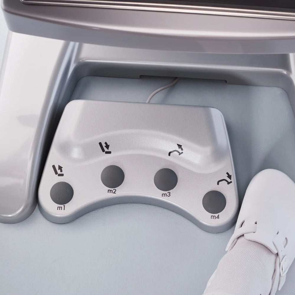 Cette troisième motorisation, unique à la version 300 M, permet d’ajuster précisément l’angle jambe/hanche, facilitant colposcopie, hystéroscopie et examens nécessitant un accès périnéal optimisé.