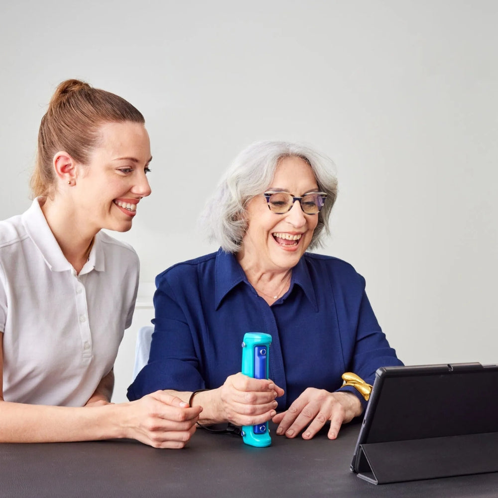 Le module intègre un dynamomètre de préhension couplé à des capteurs capables de mesurer : la force isométrique, l’endurance musculaire, la comparaison entre les côtés droit et gauche, ainsi que le « GRIT » clinique du patient. Ces données permettent d’avoir une base de référence précise et d’ajuster le programme de rééducation de façon individualisée.