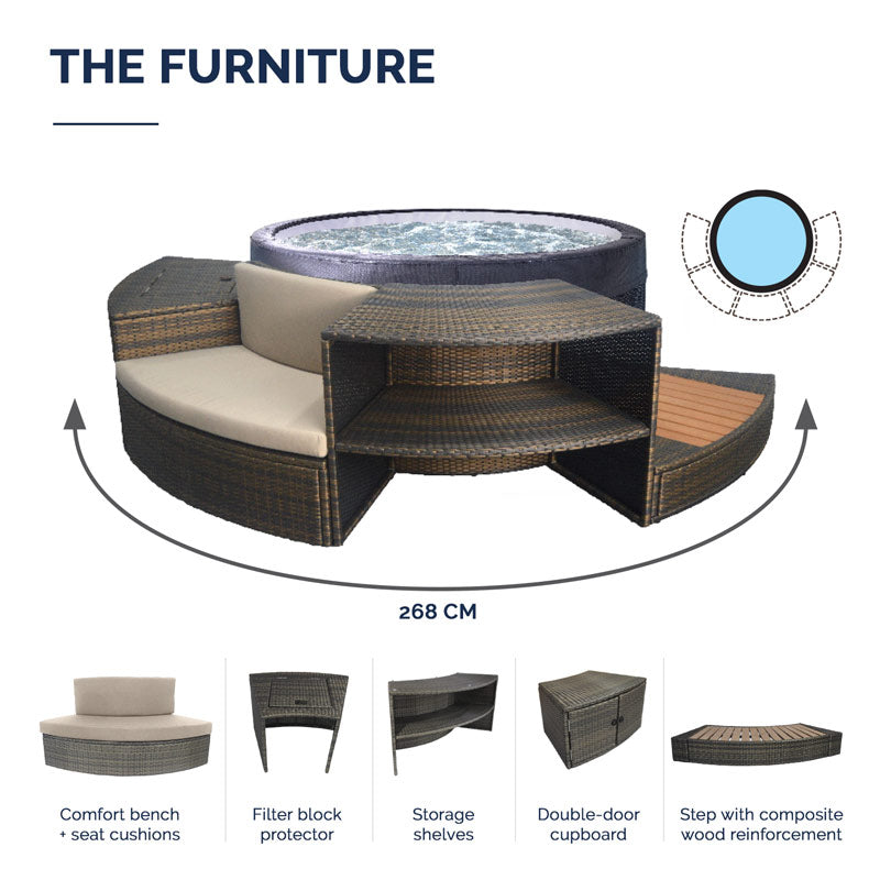 H : 70 cm | Sans mobilier : 156 cm ⌀ - Avec : 268 cm ⌀ H : 42,3 cm | Largeur : 38 cm | Longueur : 44 cm |