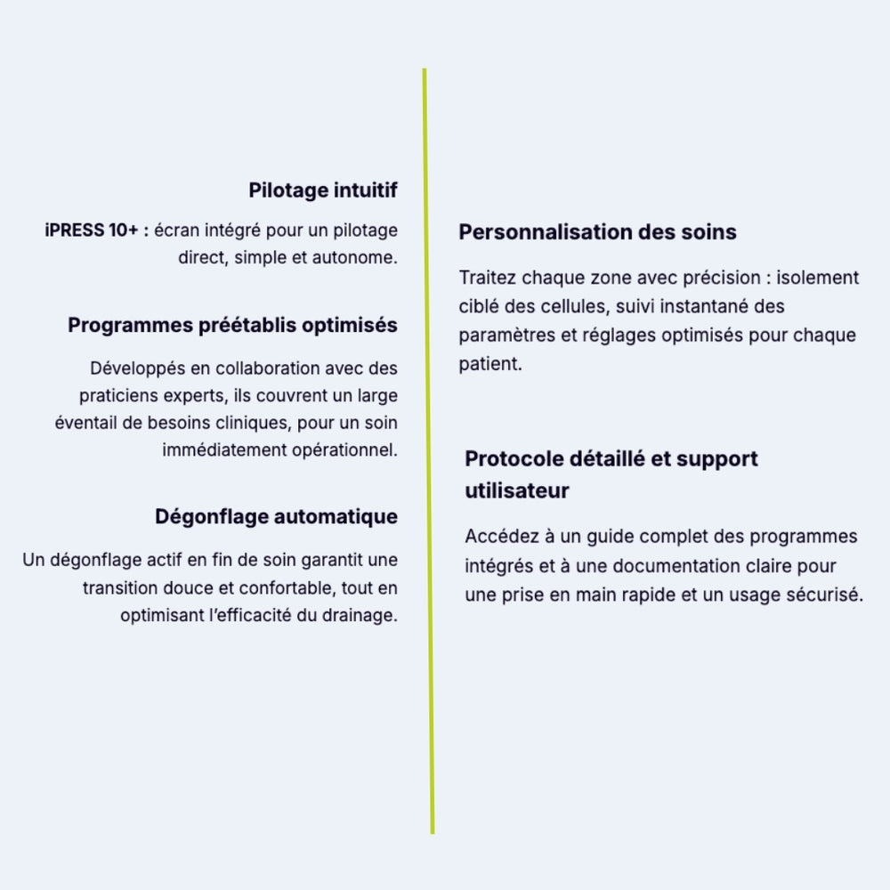 L’iPress 10+ se distingue par son nombre élevé de cellules, qui permet une précision incomparable et une pression parfaitement répartie sur toute la longueur des jambes. C’est le choix idéal pour ceux qui recherchent un appareil de pressothérapie professionnel, performant et durable, utilisable aussi bien en rééducation, en récupération sportive, qu’en esthétique médicale.