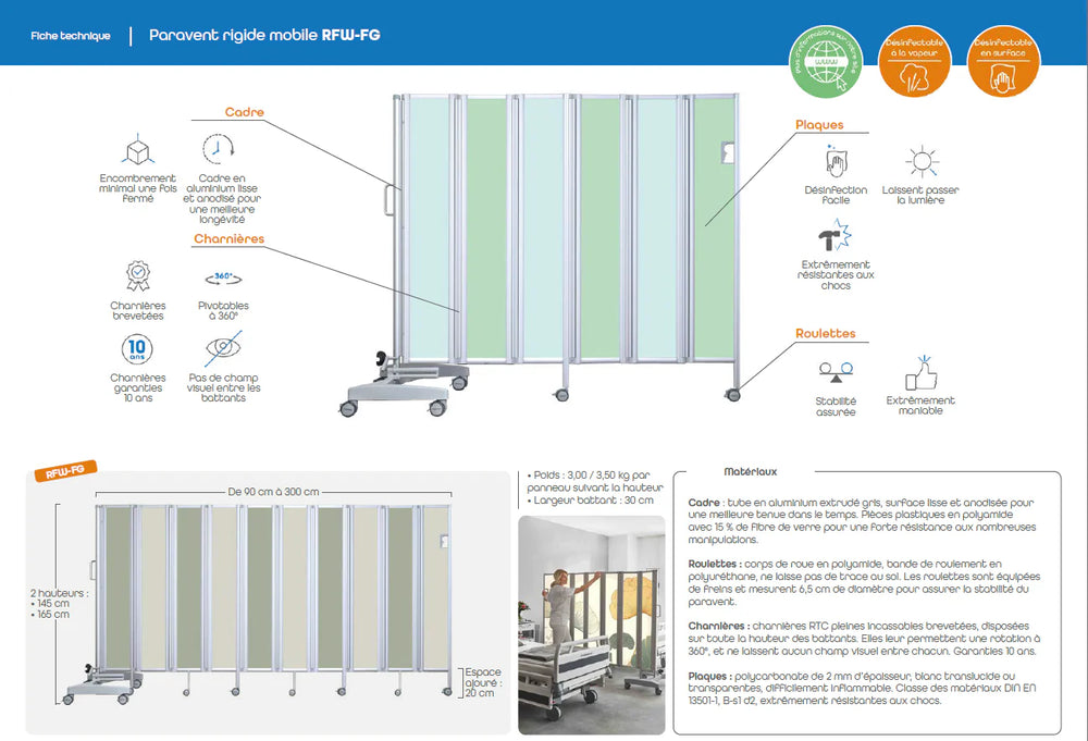 Robuste et résistant aux chocs, le paravent rigide s’utilise en toute flexibilité comme cloison de séparation dans le secteur médical. Il se met en position et se range contre le mur très rapidement après utilisation. Une extension du nombre de battants est possible même ultérieurement.
