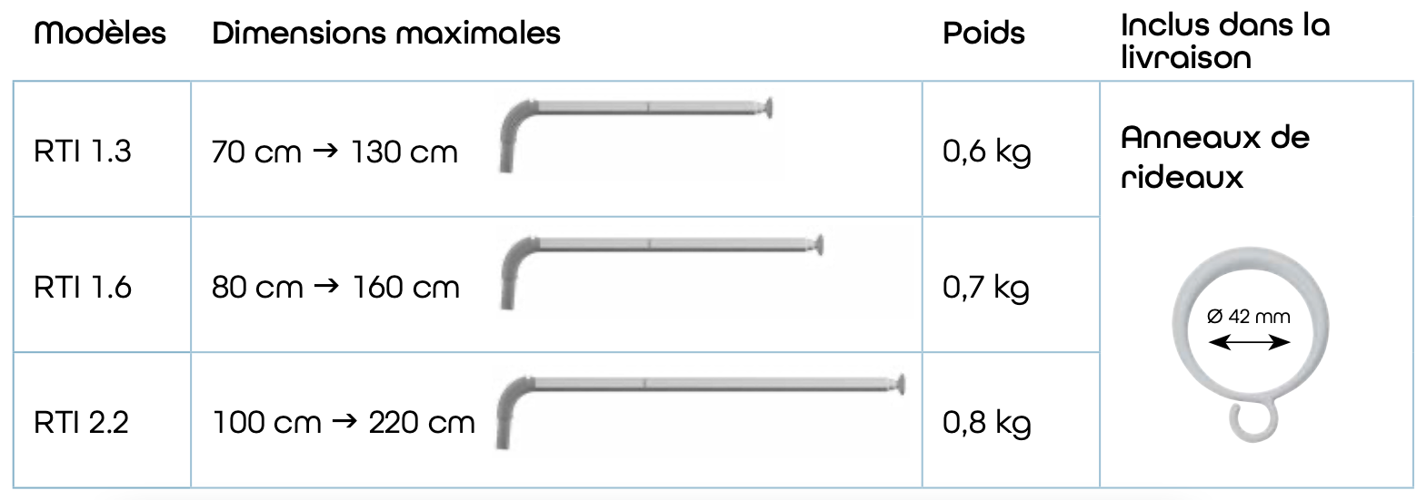 RTI 1.3 : 70–130 cm, env. 0,6 kg, livré avec 10 anneaux.