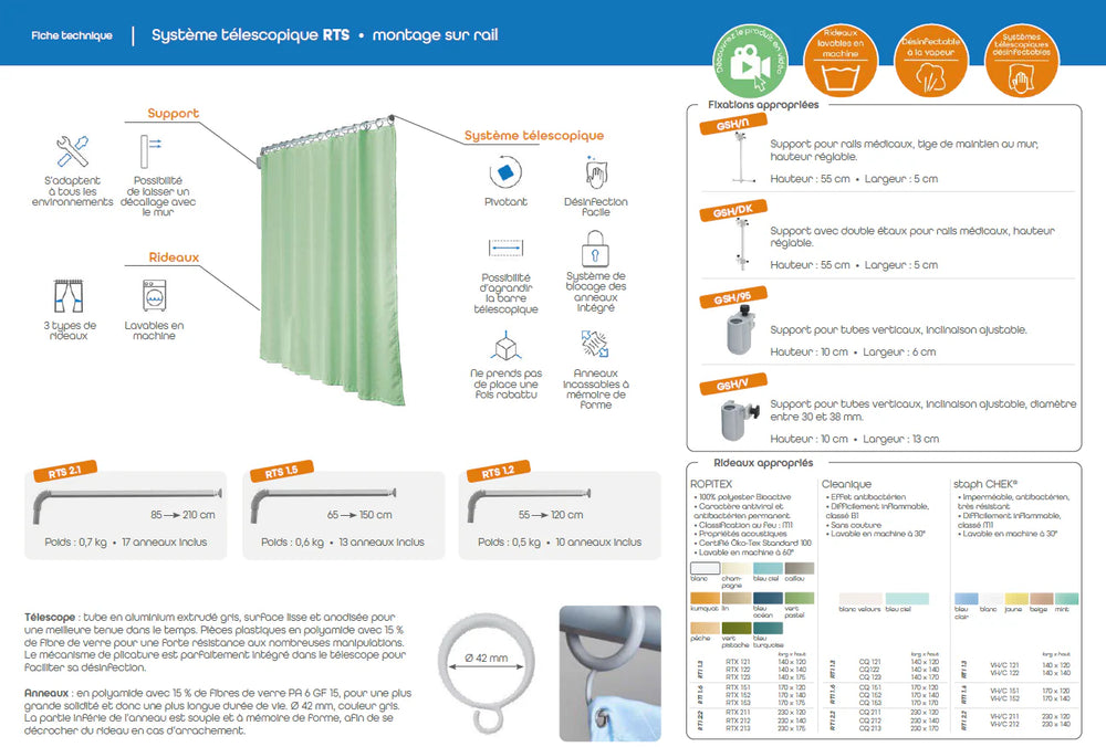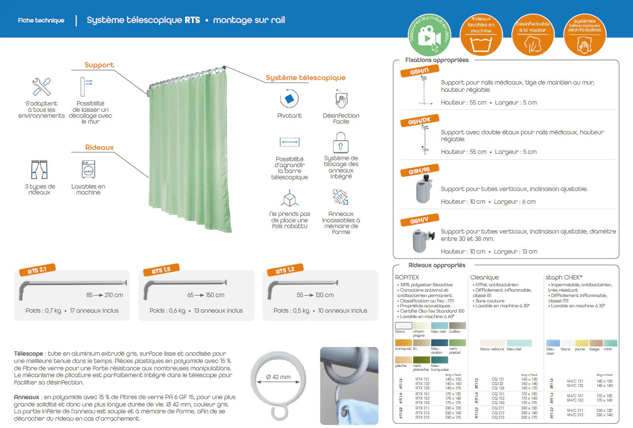 Le système télescopique RTS est une solution fiable et hygiénique pour créer des espaces de confidentialité en milieu médical (hôpital, clinique, cabinet, EHPAD ou soins à domicile). Sa structure en aluminium anodisé et composants renforcés assure robustesse, facilité de désinfection et gain de place grâce à un pivotement fluide qui se rabat contre le mur lorsque le rideau n’est pas utilisé.