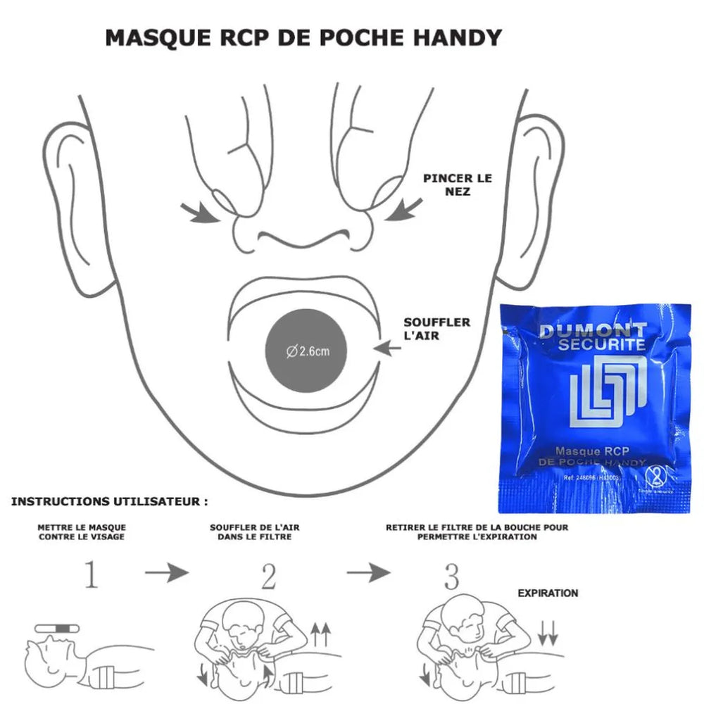 L’air est insufflé au patient lorsque le secouriste expire à travers un filtre jetable de protection, empêchant tout contact avec d’éventuelles substances biologiques infectieuses (sang, vomissements, sécrétions, etc.).