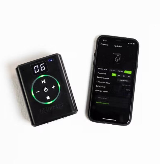 Conçu pour la mobilité, le boîtier Go X est ultra-léger et va à l’essentiel : pas de câbles encombrants, pas de branchements complexes. Il se connecte simplement au pantalon via deux ports distincts (droit/gauche) et affiche les informations clés grâce à un indicateur LED tricolore (rouge, vert, bleu). Depuis ce boîtier, l’utilisateur peut lancer un programme, ajuster l’intensité et vérifier le niveau de batterie en un geste.