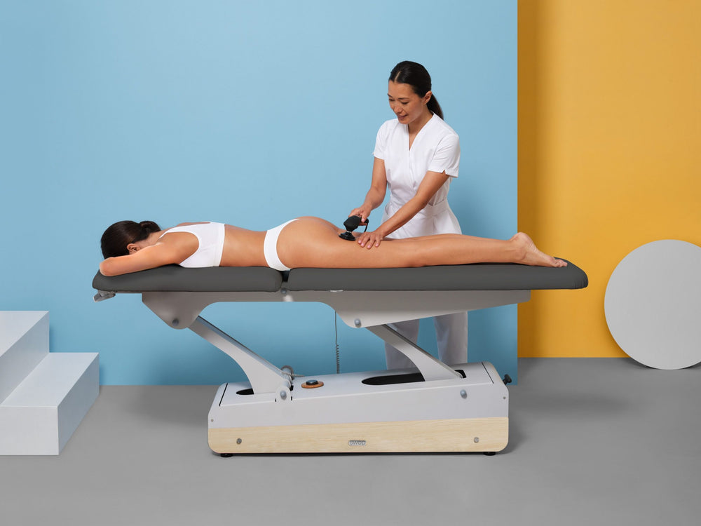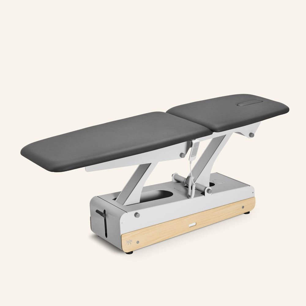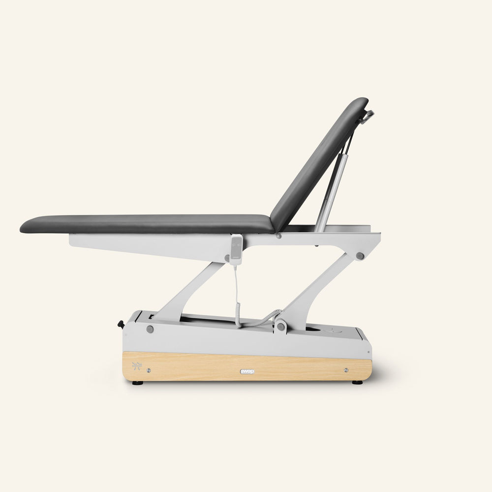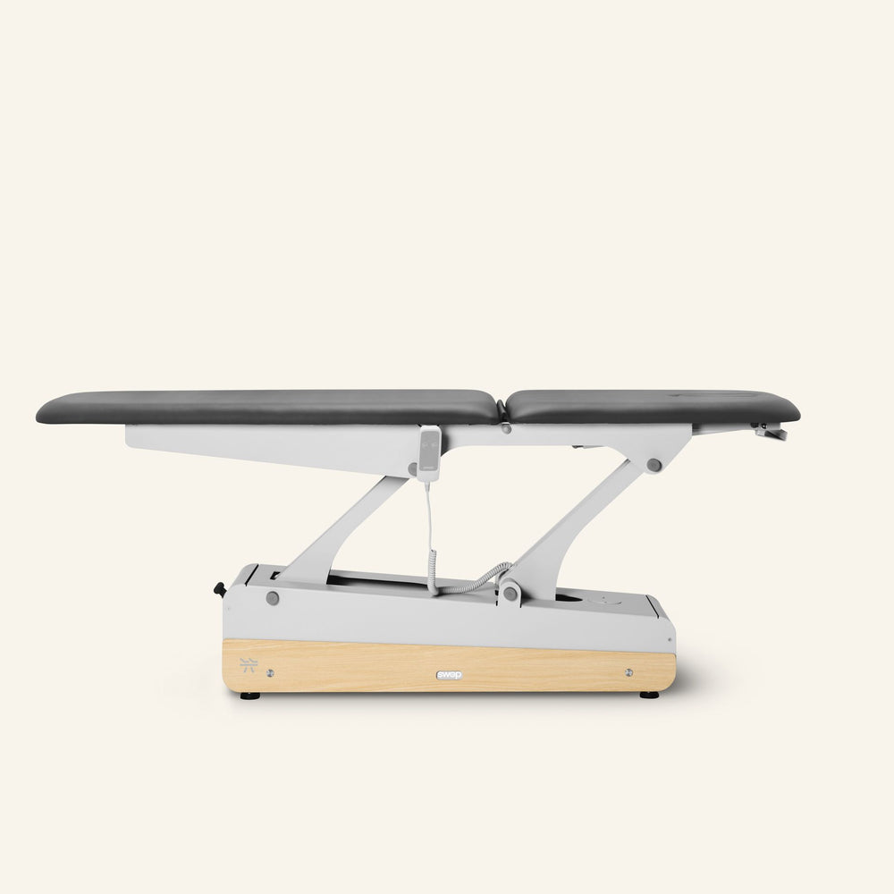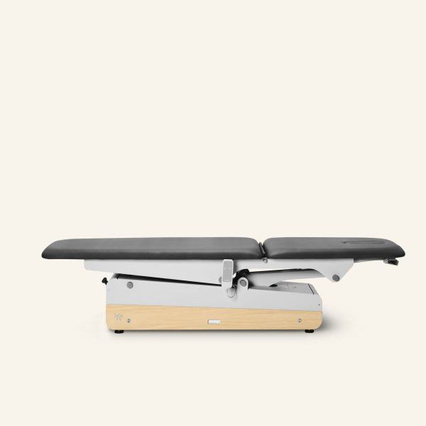 Table électrique 2 plans avec têtière longue pour traitements en position allongée ou semi-assise.